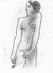 Cantre, Jozef - [Naakt], z.d. Tekening in chinese inkt, lichtjes gespat, en gehoogd met enkele accenten in witte gouache, 15 x 10 cm; gemonogrameerd onderaan links. Cfr. ill.