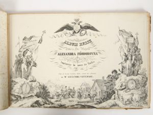 29- ALBUM RUSSE dédié à sa Majesté Alexandra Féodorovna. Impératrice de toutes les Russies. Choix de dessins d'artistes russes, extraits des collections de M. Alexandre Vittemare. Paris, Challamel 1842. In-4 à l'italienne. Rel. 1/2 toile verte...