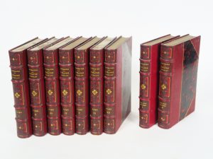 35- DUMAS Fils (Alexandre). Théâtre complet, avec préfaces inédites. (7 vol.). - Théâtre des Autres (2 vol.), Paris, Calmann-Levy 1890-1894. 9 vol. gd in-8. 1/2 maroquin rouge à coins, caissons et pces de titres mosaïqués en brun, rehaussé...