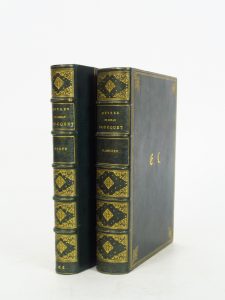 FOUCQUET (Jehan). Œuvre.?Texte restitué par l'abbé Delaunay.?Paris, Curmer 1866-1867. 2 vol. in-4. 1/2 maroquin vert à coins (volume de texte) et plein maroquin vert, encadr. dor. et fleur.?d'angle, dent. int. et doublure de tabis vert (volume de...
