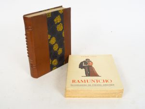 46- LOTI (Pierre). Le Mariage de Loti. Illustrations de P. -G Domergue. Paris, Calmann-Levy 1936. in-8. carré. 1/2 chagrin havane, à nerfs entrecroisés bande centrale rehaussée au pochoir, couv. et dos (Reliure style Art Déco). Illustrations...