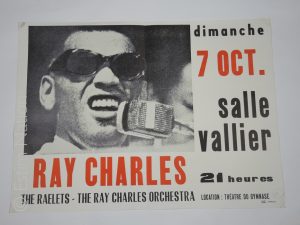 Grande affiche en noir et blanc et en rouge,format 56 x 72 cm,pour un concert de Ray Charles,années 50-60,très bon état.