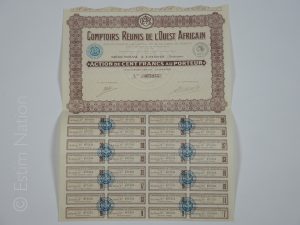 Action des comptoirs réunis de l'Ouest africain,siège social à Cotonou au Dahomey,non datée,vers 1920,très bon état.