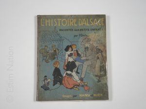 ''L'histoire d'Alsace racontée aux petits enfants'',Paris,Floury,1912,in-folio,100 pages,reliure cartonnage éditeur,illustrations de Hansi et Huen,mouillures sur le côté droit au début et à la fin de l'ouvrage.