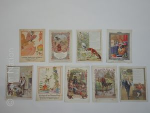 Ensemble de 10 gravures en couleurs,13 x 19 cm,de fables illustrées,années 20-30,bon état.