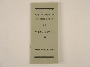 ''Vitraux d'art'',catalogue gravure sur verre et glace,vers 1920,album J.M,in-12 oblong,32 pages,état neuf,reprend les créations des établissements J.M. graveurs,