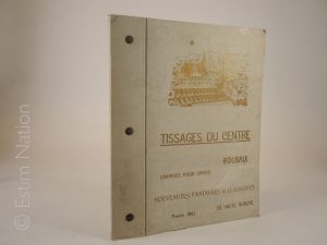 ''Tissages du centre'',cahier d'échantillons de représentation des tissages du centre à Roubaix pour l'année 1961,34 pages,(24,5cmx37cm),environ 315 morceaux de tissus collés,fort peu fréquent,