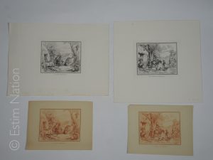 Premier ensemble de 20 gravures en noir ,avec ou sans personnages,certaines en plusieurs exemplaires identiques, en divers format,très bon état.