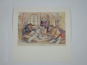 ''En famille'',aquarelle originale,signée en queue à gauche et au dos,datée 6 janvier 1947,grand format,29 x 38 cm,très bon état.