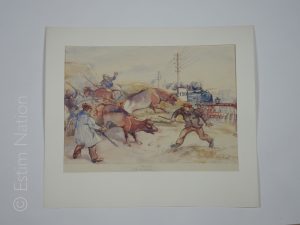 ''Fermé,v'la le rapide'',aquarelle originale,signée en queue à droite et au dos,datée 6 janvier 1947,grand format,29 x 38 cm,très bon état.