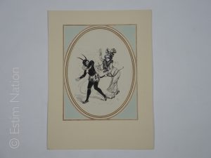 Dessin original au trait ( encre noire) sur le thème de la fête,femme au chapeau,format 17 x 22 cm ,très bon état.Mention manuscrite avec signature autographe au dos de Chamoin,datée 20 mars 1912 .