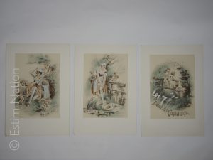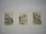 Ensemble de 7 gravures au pochoir,rehaussées à la gouache ( une page de titre illustrée et six gravures de péchés,il manque donc une gravure de péché ).22 x 32 cm,très bon état.