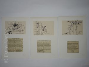 Ensemble de six gravures en noir accompagnées d'un texte de fable,24 x 40 cm,très bon état.