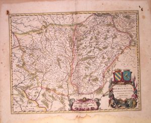 Carte XVIIe s.: LES DEUX BOURGOGNES, inférieure et supérieure. «Utriusque Burgundiæ, tum Ducatus tum Comitatus, descripto. Amsterdam chez Johannes Jansson. (Château-Chinon, Digoin, Autun, Arnay, Quingey, Chalon, Clervaux, Luxeuil...) (50 x 60...