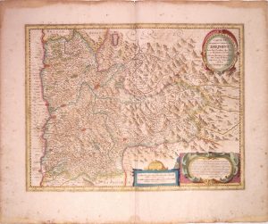 Carte XVIIe s.: «Carte et description générale de DAUPHINÉ avec les confins des Pays et provinces voisines.Le tout raccourci et réduit par Jean de Beins Ingénieur et Géographe du Roy.» (Valence, Grenoble, Romans) (50 x 60 cm) État B.