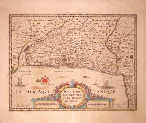 Carte XVIIe s.: BORDEAUX. LE MÉDOC. «Bourdelois, Pays de Médoc, et la Prevoste de Born. (Bordeaux (33), Bayonne (64)). Amsterdam, exécuté par Johannes Jansson (1588-1664). Carte horizontale vers 1635. (50 x 58,5 cm). État B.
