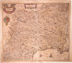 Carte XVIIe s.: «Languedocia, vulgo LANGUEDOC» (Rouergue, Albigeois, Gévaudan, Velay,...). Amsterdam chez Johannes Jansson. (49,5 x 57 cm) État B.