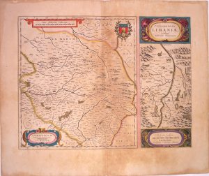 Carte XVIIe s.: LE LIMOUSIN & LA LIMAGNE (Centre de l'Auvergne) Lemovicum auctore Jo. Faiano, Lymosin.Topographia Limaniæ, Auctore Gabriele Simoeno. Amsterdam, chez Guillaume Blaeu Cartographe. (50,5 x 60,5 cm) État B.