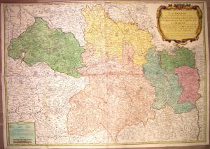 Carte de 1721: «Gouvernement général du LYONNOIS qui comprend les Provinces du Lyonnais, Forez, Beaujolais, Bourbonnais, Auvergne, et la Marche. Divisé en trois généralités, savoir celles de Lyon, de Moulins et de Riom. Et subdivisées par...