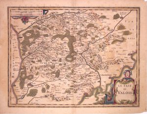 Carte XVIIe s.: «Le Pais de VALOIS», Hendrick Hondius, 1620 (Crépy, la Ferté-Milon, Senlis, Villers- Cotterêts, Soissons, La-Ferté-Sous-Jouarre, Meaux...) - (42,5 x 54,5) Etat B.