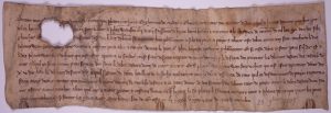 1335. FLANDRE. TOURNAY. Charte partie (9 x 28) en Dialecte Picard. 28 Novembre 1335. Reconnaissance de dette par Jehan Mathieu ENGHERRAN DE CANDAS et Olivier EVRARD, tous trois «Manant de sous Mihiel de Harnes.»