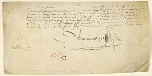 (ARMÉE DE TURENNE. 1528.) Quittance du paiement des gages de Barthélémy D'ESTAPOUIS l'un des Cent Gentilshommes de la Maison du Roy, notre sire, sous la charge de Monseigneur le Vicomte de TURENNE. Pièce signée DE LA PRIMAUDAYE le 17 décembre...