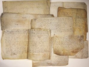 (CALVADOS) 9 Parchemins concernant le Fief DOUESY et la famille Noble DOUESY D'OLLANDON, de 1559, 1584. 1587, 1606, 1613, 1620, 1628, 1630 et 1643. Formats divers. Qqs défauts.Noble Guillaume DOUESY en sa Terre et Seigneurie de DOUESY assise à SACY...