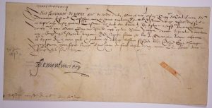 de Sa Majesté.» le 30 Juin 1573. Quittance de la somme de 800 Livres tournois pour un quartier de ses gages pour son «estat de Capitaine..» a lui payée par Me Estienne de Bray Conseiller du Roi et trésorier de son épargne. Parchemin (13 x 28)