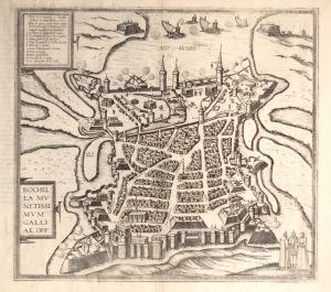 CHARENTE-MARITIME. Gravure du 1574 de la Ville de LA ROCHELLE et ses remparts. «Rochella munitissinum galliae opp.» J. Braun/F. Hogenberg. Cologne 1574. (40 x 52,5) Etat A. texte français au verso.