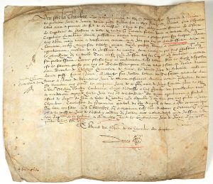 (1586. YVELINES) CAPITAINE DU CHÂTEAU DE LA VILLE D'HOUDAN (78). Parchemin (29 x 33)- Extrait des registres de la Chambre des Comptes fait le 23 Juin 1586. La Chambre ordonne que le Sieur de la BOISSIÈRE, pourvu de l'Office de Capitaine du Château...