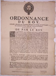 Troupes qui sont en garnison dans ses Places, ne laissent pas d'aller prendre le SEL dans les lieux où la Gabelle n'est pas établie, & de l'apporter, et le vendre secrètement dans ceux où elle a cours, ce qui, outre la licence desdits Soldats, tourne au préjudice & diminution de la Ferme de ses Gabelles...... Ceux qui sont prévenus du crime de Faux-saunage seront condamner à servir Sa Majesté comme Forçats sur les Galères à perpétuité...» Signé (impr.) du Roi LOUIS XIV, et plus bas LE TELLIER.Suivi de l'Ordonnance signée du Sieur BOUCHU Intendant en Bourgogne et Bresse. (avec Signature autographe.)Fait à DIJON le 24 Janvier 1683. L'Ordonnance sera exécuté «et affichée aux Châteaux de DIJON & d'AUXONNE, & dans la Citadelle de CHÂLON-SUR-SAÔNE.»Placard (50 x 37). État B.