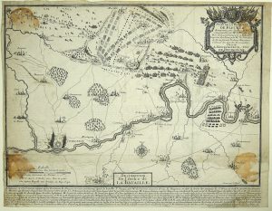 GRAVURE: «PLAN DE LA BATAILLE DE FLEURUS remportée par l'Armée du Roi commandée par Mr le Maréchal Duc de LUXEMBOURG le 1er Juillet 1690, levé sur les lieux par M. le Chevalier de GRANDMONT VEDEAU Enseigne Colonel des Gardes Françaises....