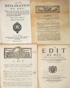 PARIS, chezFrançois MUGUET, Premier Imprimeur du Roy, & de la Cour des Aydes, rue de la Harpe, aux trois Rois. 1699 - Vignette royale - Impr. 3pp in-folio - + «Édit du Roi, donné à Compiègne au mois de Juillet 1764, concernant la liberté de la sortie & de l'entrée des Grains dans le royaume.» - Impr. à Grenoble, chez André GIROUD; 6pp in-4°.+ «LOI contenant le TARIF GÉNÉRAL des Droits qui seront perçus à toutes les entrées & sorties du royaume.Données à Paris le 15 mars 1791.» N°661. Impr. à PARIS, de l'Imprimerie royale, 1791. 44pp in-4° - (Liste de toutes les denrées avec leurs droits de douanes.) + «LOI relative aux droits d'Entrée sur les DENRÉES COLONIALES» Donnée à Paris le 29 mars 1791. (Sucres, café, cacao, indigo... Cayenne, Saint Domingue, Martinique...) - Impr. à Nîmes, chez C. Belle, Imprimeur du roi et du Département du Gard, 171; Impr. 5pp in-4°.Les quatre: