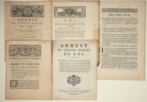 BRASSEURS de la ville d'ABBEVILLE.. contre le Sous-Fermier des Aydes de la Généralité d'AMIENS & autres Brasseurs de la Ville d'Abbeville, & Arriers-Fermiers des droits d'Aydes sur les bières en la ville et banlieue d'Abbeville et les Maire & Echevins de la même ville.." - Imprimé 10 pages in-folio - + MANUFACTURE D'AMIENS - "Arrest du Conseil d'État du Roy, portant Nouveau Règlement pour la Manufacture d'AMIENS." - Du 19 novembre 1722 - Imp. de 7pp in 4 avec bandeau; Fait à PARIS, de l'Impr. Royale - «...SaMajesté étant informée que depuis la suppression desdits Egards-Ferreurs en Blanc, il s'est introduit dans la Manufacture d'Amiens une infinité d'abus, tant parce que les HOUPIERS, FABRIQUANTS, TEINTURIERS & autresOuvriers employés dans la dite Manufacture n'ont plus été surveillé...A quoy Sa Majesté voulant pourvoir par un nouveau Règlement, en rétablissant les Fonctions desdits Egards-Ferreurs en Blanc...» - + (SOMME) BARONNIE DE LUCHEUX - "Arrest du Conseil d'État du Roy, du 22 novembre 1723, qui déclare nulles 64 Adjudications, des Biens de la Baronnie de LUCHEUX, & les deux exploits y énoncés; Condamne le nomméCandelier & Charles BUTIN, en 200 Livres d'amende chacun, pour n'avoir pas présenté leurs Minutes & Liasses;Et encore ledit Butin en 12800 Livres d'amende, pour n'avoir pas fait contrôler lesdites 64 Adjudications, & c." - Vignette & Lettrine - Impr. à PARIS, chez JOUVENEL, 8pp in-4° + (SOMME) - "De par les Lieutenant Général de Police, Maire et Échevins de la Ville d'AMIENS. Ordonnance pour la Police en général & notamment des Remparts, Fortifications, Travers d'eau, Promenades, Assemblées, Jeux, Cabarets, & tous autres lieux publics, Lanternes, & Batailles ou Mahonages." - 2 Nov. 1754 - Impr. 8 pp in-8° - + RIVIÈRE DE SOMME - «Loi relative à la police des transports sur la Rivière de SOMME.» - Donnée à Paris, le 17Novembre 1790 - «... autorise tous Bateliers établis sur la Rivière de Somme, à voiturer, comme les Gribaniers, les marchandises & autres objets, de SAINT-VALERI à AMIENS, & d'Amiens à Saint-Valeri, & autres lieux le long de la rivière de Somme, au prix dont ils conviendront de gré à gré avec les marchands propriétaires & commissionnaires de marchandises. Fait défenses aux Gribaniers & à tous autres, de troubler ceux qui seront choisis par les Marchands, à peine d'être poursuivis comme perturbateurs du repos public...» - Bandeau - Impr.à PARIS, de l'Imprimerie Royale, 1790; 3pp in-4°.Les cinq: