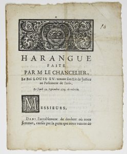 LOUIS XV ROI DE FRANCE - "HARANGUE faite par M. le Chancelier, le Roi louis XV tenant son lit de Justice au Parlement de Paris, le 12 septembre 1715." - "Messieurs dans l'accablement de douleur où nous sommes, causée par la perte que nous venons de...
