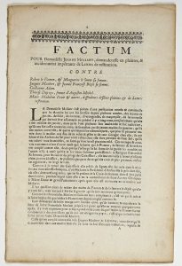 & sa Femme, etc...» - Mémoire de procès impr. 12 pp in-folio - Suivi de la Réponse sommaire au Factum de Jeanne MOISANT, Impr 4pp in-4° - Suite à une multitude de vols chez les voisins de ladite Moisant, on a retrouvé des objets volés qu'elle cache chez elle. Moisant est la seule coupable !!! (détails de l'enquête.) - «Le Demoiselle MOISANT s'est plainte d'une persécution outrée & continuelle que les Accusés lui ont fait souffrir depuis plusieurs années, des injures de putain, de folle, de sorcière, d'ivrognesse, de maquerelle, de laronnesse qui devrait être assommée ou pendue... Comme à la venue des Cuirassiers elle refusa de signer, elle fut mise dans la Maison des NouvellesCatholiques, d'où Madame la Présidente d'Anfreville la prit chez elle ..., qui lui fit présent de la Croix de diamant dont il sera parlé dans la suite...».