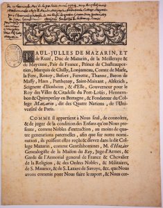 de Châteauportien, Marquis de Chilly, Longjumeau, Comte de Marle, le Fere, Rozoy, Befort (Belfort), Ferrette, Thanne, Baron de Massy, Ham, Parthenay, Saint-Maixent, Altkirch, Gouverneur pour le Roy des Ville et Citadelle de Port-Louis, Hennebont & Quimperlé en Bretagne, Fondateur du Collège MAZARIN, dit des Quatre Nations... - Nous avons commis M. d'HOZIER Généalogiste de la Maison du Roi, Juge d'Armes, & Garde de l'Armorial de France, pour nous certifier la validité de Noblesse des 4 degrés de génération paternelle de Jean GérardMUYARD, gentilhomme de la Franche Comté pour être reçu au nombre des Gentilshommes qui sont élevés dans le Collège MAZARIN. Fait à Paris le 10 May 1721. 2pp in-4° -
