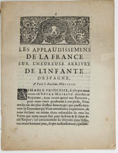 (L'INFANTE D'ESPAGNE) "LES APPLAUDISSEMENTS DE LA FRANCE sur l'heureuse arrivée de L'INFANTE D'ESPAGNE", à Paris le 2 mars 1722 - Imprimé 4pp in-4°, chez la V. VAUGON rue de la Huchette, du coté du PontSaint-Michel. Bandeau & lettrine -...