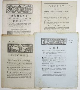 abus qui se commettent aux Déchirages des Bateaux dans tous les Ports, d'Amont & d'Aval, BOSSE-DE-MARNE, PORT-À-LANGLOIS, SÈVRE & autres...Fait défense Sa Majesté à tous Déchireurs de Bateaux & à tous autres d'enDéchirer aucun, sans en avoir au préalable fait déclaration au Bureau dudit GIRARD, & en avoir obtenu la permission par écrit, faisant mention du paiement des Droits, à peine de confiscation des Bateaux Déchirés ou des Bois qui en feront provenus..." - Impr. 3pp in-4° - + «Loi relative aux Droits à percevoir sur les Marchandises provenant du Commerce Français au-delà du Cap de Bonne-Espérance.» - du 12 Décembre 1790. N°203. - Impr. au MANS, chez De Pivron; 3pp in-4° + Décret de la Convention Nationale du 20 septembre 1793, qui met en réquisition tous les objets propres à la construction, armement & équipement des Vaisseaux & frégates.» (liste des marchandises.)- N° 1577 - Impr. à Paris, de l'Impr. du Louvre. Griffe de GOHIER et cachet rouge de la République: 4pp in-4° + «Décret de la Convention Nationale du 8 avril 1793, qui supprime le droit de frêt dans le cas de grand cabotage par les navires étrangers.» N° 727 - Impr. à Nîmes, chez C. Belle; 3pp in-4°.Les quatre:
