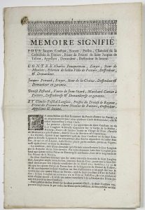 POITIERS (VIENNE) - "MÉMOIRE SIGNIFIÉ pour Jacques CONSTANT, Ecuyer, Chanoine de la Cathédrale de POITIERS (86) ... contre Charles FOUCQUETTEAU Ecuyer, Sieur de Mortiers, Jacques PEIRAUD Ecuyer, Sieur de a Chaize. Denise Fesrant Veuve de Jean...