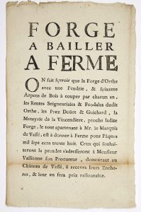 FORGE D'ORTHE à ST-MARTIN-DE-CONNÉE (MAYENNE); CHÂTEAU DE VASSÉ à Rouessé-Vassé (SARTHE): Affiche (31 x 19) «FORGE À BAILLER À FERME. On fait savoir que la forge d'Orthe avec une Fendrie, & soixante arpents de bois à couper par chacun an,...