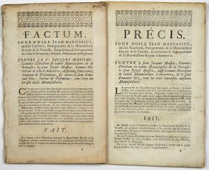 (HAUTE-GARONNE.) 2 Imprimés de procès (vers 1739.):FACTUM et PRÉCIS, «pour Noble Jean MARCASSUS Ancien Capitoul, entrepreneur de la Manufacture royale de LA TERRASSE, Propriétaire et Entrepreneur de celle D'AUTERIVE, intimé, Contre le Sieur...