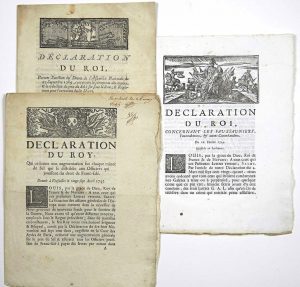 Parlement - ".. nous avons ordonné que tous ceux qui seraient condamnés aux Galères à temps ou à perpétuité..seraient flétris avant d'y être conduits, des trois Lettres G.A.L. afin qu'en cas de récidive... les Juges fussent en état de prononcer contre eux des condamnations plus rigoureuses, même la peine de mort..." - + "Déclaration du Roy, qui ordonne une augmentation sur chaque minot de SEL qui se distribue aux Officiers qui jouissent du Droit de FRANC-SALÉ." - 27 avril 1745 - Bandeau et lettrine - Imp. 3pp in-4° + "Déclaration du Roi, portant Sanction du Décret de l'Assemblée Nationale du 23 Septembre 1789, concernant la perception des impôts, & la réduction du prix du SEL à six sous la livre; & Règlement pour l'exécution duditDécret." - du 27 Septembre 1789 - Imprimé à Moulins, 8pp in-4° - Bandeau décoratif.Les trois: