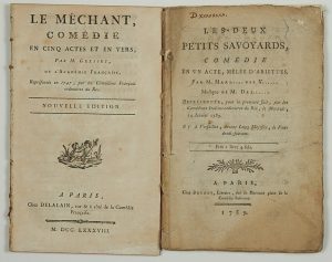 à coté de la Comédie Françaises, 1788 - (dérelié) - 60pp in-8° - + «LES DEUX PETITS SAVOYARDS, Comédie en un acte, mêlée d'ariettes par M. Mars... des V... Représentée, pour la première fois, par les Comédiens Italiens ordinaires du Roi, le Mercredi 14 Janvier 1789 - Impr. à Paris, chez Brunet, rue de Marivaux, Place de la Comédie Italienne. 1789, 70pp in-8°.Les deux: