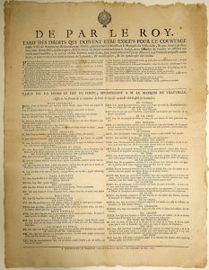 LANGUEDOC. SOMMIÈRES (GARD) Placard (58 x 45). «TARIF DE LA LEUDE ET FIEF DE COUPE, appartenant à M. le Marquis de VILLEVIELLE.» Texte en Français et Languedocien - «De par le Roy. Tarif des Droits qui doivent être exigés pour le Courtage de...