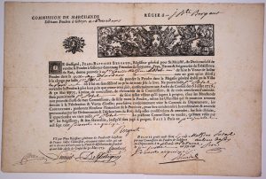 Royaume. Il donne pouvoir au Sieur POTEL de faire la vente de laditePoudre dans la Ville de DOURDAN, tant en gros qu'en détail. Fait à Paris le 1er Juillet 1775. Brevet imprimé rempli à l'encre (24,5 x 37). Bandeau décoratif.