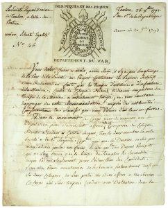 la Constitution. District de TOULON.» «Vous devez, frères et amis, avoir reçu, il y a pas longtemps de la part de la société un paquet contenant des papiers relatifs à une réclamation faite par les troupes d'artillerie et d'infanterie de la Marine, contre le CitoyenNIEUIL ci-devant Inspecteur des troupes de la Marine et actuellement Émigré; en vous invitant d'appuyer de votre recommandation auprès des autorités compétentes la remise que nous vous prions de leur en faire...» 3 pp in-4°.