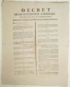 POSTES & MESSAGERIES. 1793. Placard (49 x 39) «Décret de la Convention Nationale, du 9 avril 1793, concernant LES MESSAGERIES, LA POSTE AUX LETTRES & LA POSTE AUX CHEVAUX.» en 13 articles: Art. 5)La Poste aux Lettres, les Messageries & la Poste...