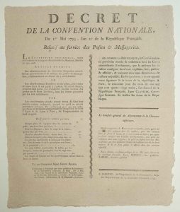 POSTES & MESSAGERIES. 1793. Placard (38 x 31) «Décret de la Convention Nationale, du 1er Mai 1793, relatif au service des Postes & Messageries.» TARIF POUR LES VOITURES PAR TERRE; pour chaque place de voyageur dans les voitures de Poste; pour les...