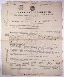 PARIS. SECTION DE MARAT. 1793 - Certificat de Résidence fourni en exécution de la Loi rendue contre les ÉMIGRÉS, en date du 28 mars 1793, du 20 Ventôse An 2, pour François SOMMELLIER demeurant à PARIS rue du Théâtre Français - Vignette &...